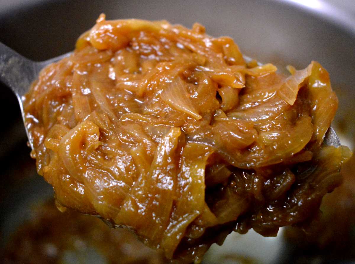 5 – Lorsque les oignons sont bien tendres et translucides, ajoutez le miso et diluez-le dans l’eau qu’ont normalement rendu les oignons, à l’aide d’une spatule en bois. Remuez et laissez mijoter à feu doux sans couvercle pendant quelques minutes afin que les oignons s’imprègnent du miso et que l’excédent d’eau s’évapore. La sauce est prête lorsque les oignons ont complètement absorbé le mélange avec le miso.